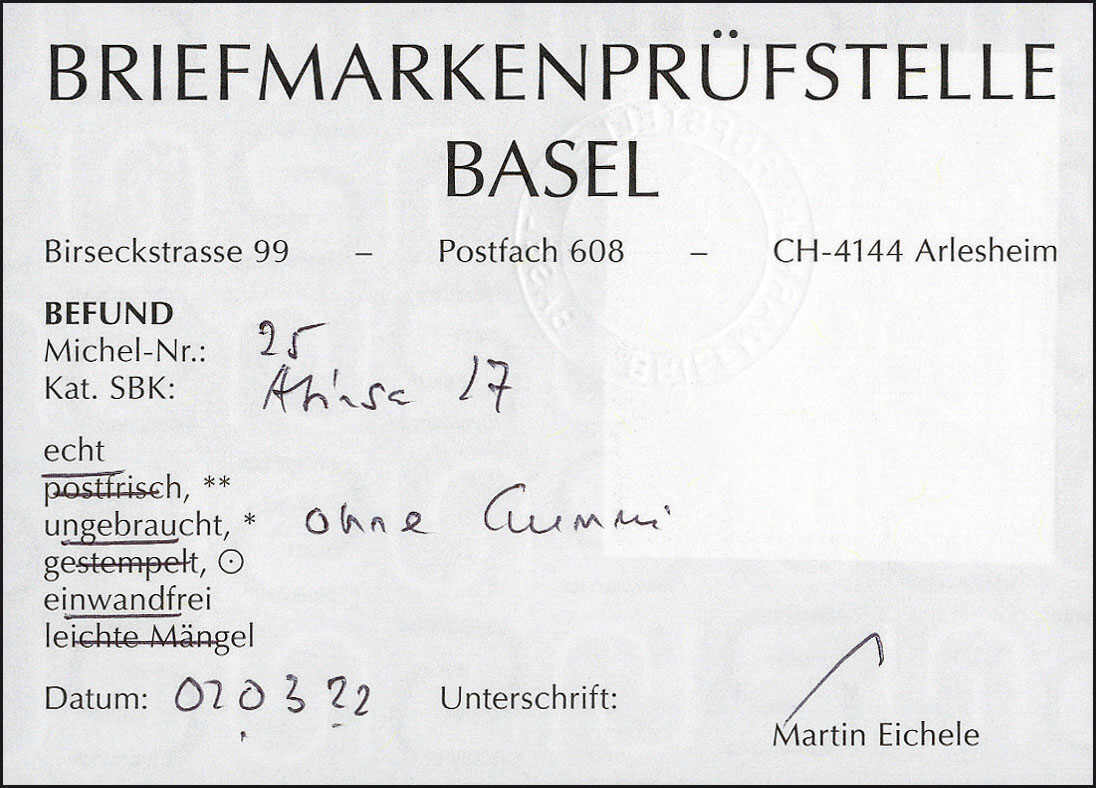 | Prüfer: | Eichele, Martin (BPB (Briefmarkenprüfstelle Basel)) |
