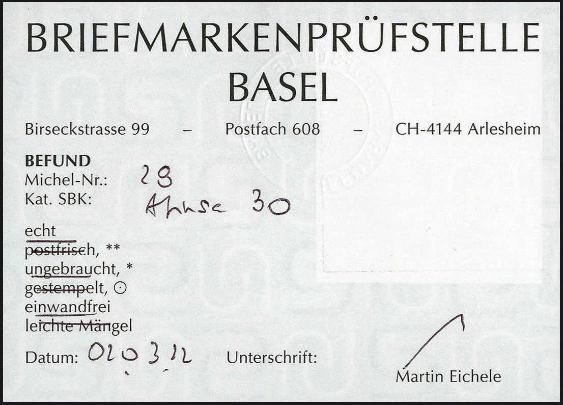 | Prüfer: | Eichele, Martin (BPB (Briefmarkenprüfstelle Basel)) |