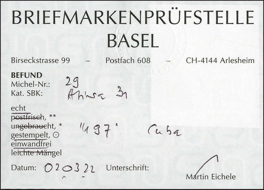 | Prüfer: | Eichele, Martin (BPB (Briefmarkenprüfstelle Basel)) |