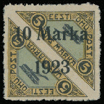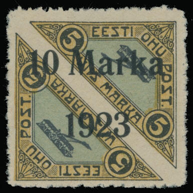 | Zusatzinformationen und Suchstichworte: | Raritan Stamps - 93. Auktion Auktionstermin: Verschoben auf 1. - 3. Juni 2022 Los 910 Estland 1923, black surcharge 10m on Airplane 5m+5m yellow, black and light green, Aeronaut (Paevaleht) original perforation 11½, full OG, previously hinged, VF and very scarce the ''key'' value of the Estonian Air Post, only 300 stamps were perforated (certificate says - 400), T. Loebbering certificate, C.v. $650, Est. $500-$600 Zuschlag 350,00 USD |