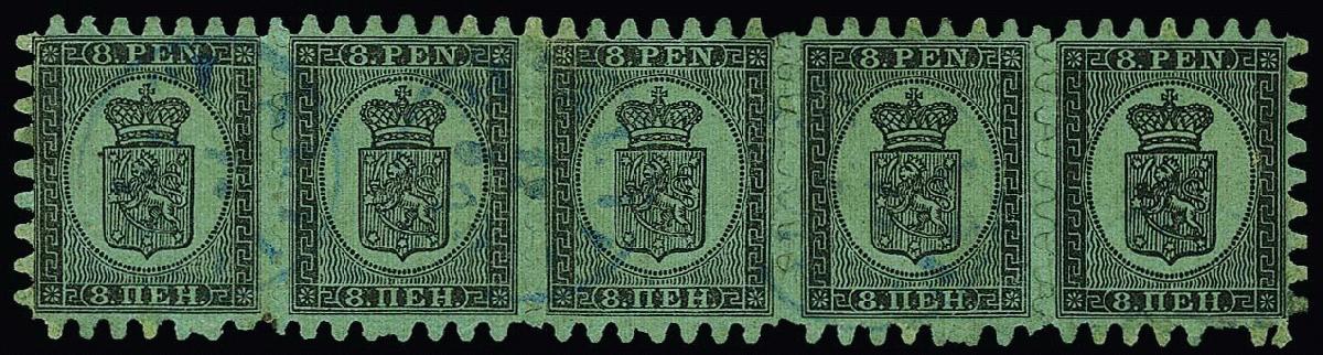 | Zusatzinformationen und Suchstichworte: | Rauhut & Kruschel - 212. Auktion Auktionstermin: 30. Juli 2022 Los 4516 Finnland 8 P. schwarz auf gelbgrünem geripptem Papier, Durchstich B (mit kurzen Zungen), sauber gestempelter Fünferstreifen in meist guter Zungenqualität (siehe Foto), eine Zunge rechts unten fehlt, sehr seltene Einheit (zwei Paare 1500,- Mi.!), ex Sibelius, Attest Tuori Ausruf 350,00 EUR |