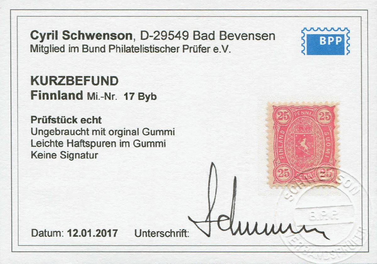 | Zusatzinformationen und Suchstichworte: | Schlegel Online-Shop Los 4402800039 Finnland 1875, 25 P. anilinrot, ungebrauchter Einzelwert, Originalgummi mit leichten Haftspuren im Gummi, Kurzbefund Schwenson BPP 01/23017, saubere Qualität Festpreis 30,00 EUR |