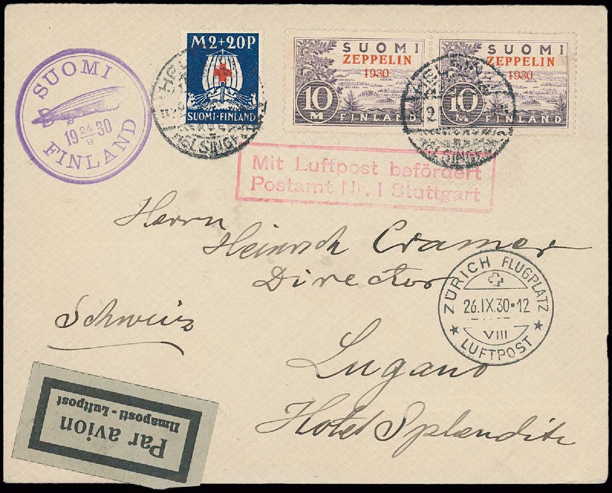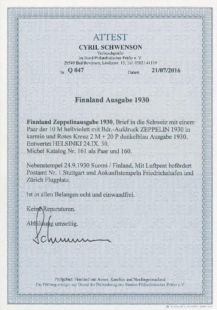 | Zusatzinformationen und Suchstichworte: | 3. Sellschopp Auktion Auktionstermin: 11. Juni 2022 Los 763 Finnland 1930, 10 Markkaa Landschaft am Saimaa-See Platte I hellviolett, mit Aufdruck ZEPPELIN 1930, waagerechtes Paar in Kombination mit 2 M + 20 P Rotes Kreuz 1930, sauber zentrisch entwertet "HELSINKI 24.IX.30" auf Briefumschlag nach Lugano. Vorderseitig mit beigesetztem violettem K2 "SUOMI 24/9 1930" mit Zeppelin und Durchgangs-Stempel "ZÜRICH 26.IX.30", rückseitig mit Durchgangs-Stempel "FRIEDRICHSHAFEN 25.9.30"l. Fotoattest Cyril Schwenson BPP: "In allen Belangen echt und einwandfrei". Ausruf 250,00 EUR |