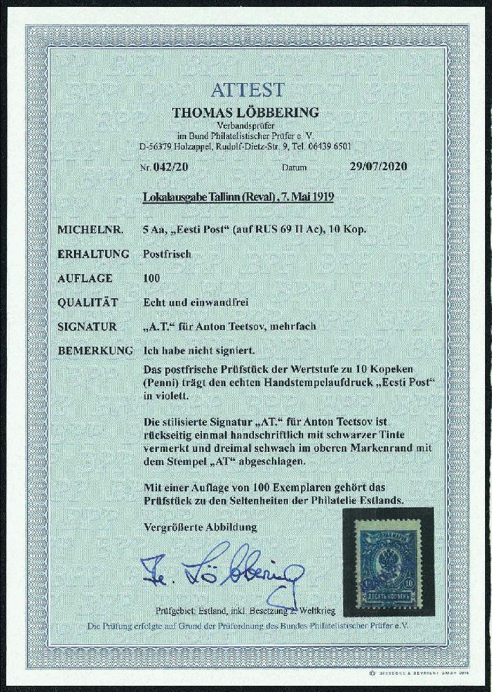 | Zusatzinformationen und Suchstichworte: | Gert Müller 114. Auktion Auktionstermin: 25. Mai 2022 Los 2551 Estland Lokalausgabe Reval 10 Kop. dunkelblau mit diagonalem Handstempel "EESTI POST", farbfrisch und tadellos postfr. Die Gesamtauflage belief sich auf lediglich 100 Exemplare, sodass postfr. Werte hiervon nahezu unbekannt sind. Eine Rarität dieses Gebietes! Fotoattest "ECHT UND EINWANDFREI" Löbbering BPP. Ausruf 800,00 EUR |