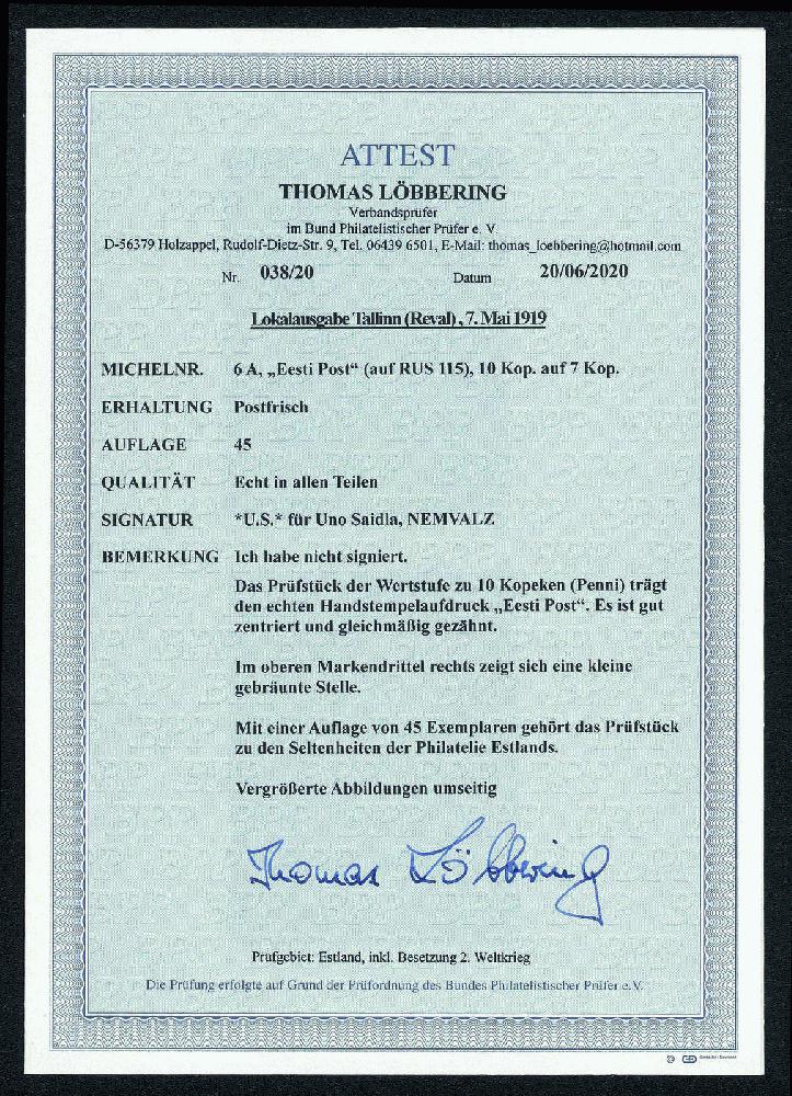 | Zusatzinformationen und Suchstichworte: | Gert Müller 114. Auktion Auktionstermin: 25. Mai 2022 Los 2552 Estland Lokalausgabe Reval 10 Kop. auf 7 Kop. blau mit diagonalem Handstempel-Aufdruck "EESTI POST", farbfrisch und perfekt gezähnt, bis auf eine geringfügige Tönung im unteren Markenbereich tadellos postfr. Mit einer Auflage von lediglich 45 Exemplaren gehört diese Briefmarke zu den großen Raritäten Europas. In postfr. Erhaltung nahezu unbekannt und ein absolutes Spitzenstück der Baltikum-Philatelie! Fotoattest Löbbering BPP. Ausruf 4.000,00 EUR |