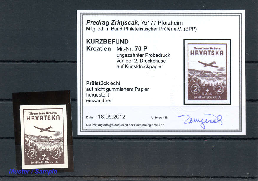 | Zusatzinformationen und Suchstichworte: | WebShop Los 19994504339 Kroatien 1942, 2 K. Modellflugzeug vollständig ungezähnt als Probedruck in der 2.Druckphase auf nicht gummiertem Kunstdruck-Papier hergestellt. Farb- Kurzbefund Predrag Zrinjscak BPP vom 18.5.2012 "echt und einwandfrei" Festpreis 20,00 EUR |