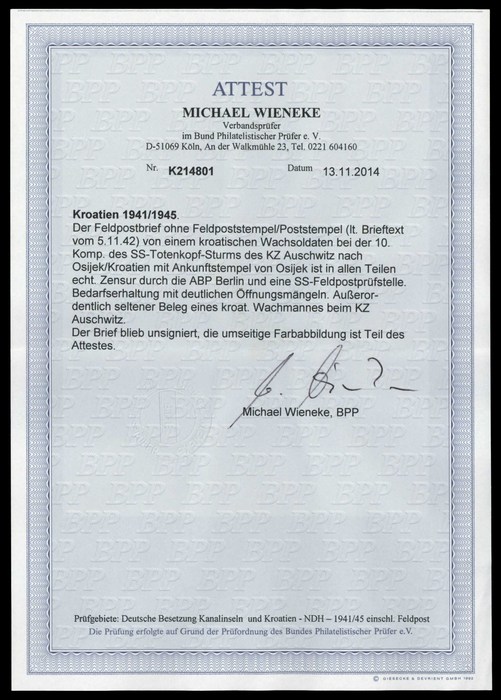 | Zusatzinformationen und Suchstichworte: | DBA Freiburg GmbH Los 1330200250 Kroatien Feldpostbrief ohne Feldpoststempel/Poststempel (lt. Brieftext vom 5.11.42) von einem kroatischen Wachsoldaten bei der 10. Komp. des SS-Totenkopf-Sturms des KZ Auschwitz nach Osijek/Kroatien mit Ankunftstempel von Osijek. Zensur durch die ABP Berlin und eine SS-Feldpostprüfstelle. Bedarfserhaltung mit deutlichen Öffnungsmängeln. Außerordentlich seltener Beleg eines kroat. Wachmannes beim KZ Auschwitz. Attest Wieneke BPP Festpreis 360,00 EUR |