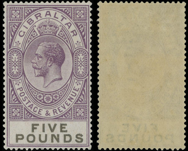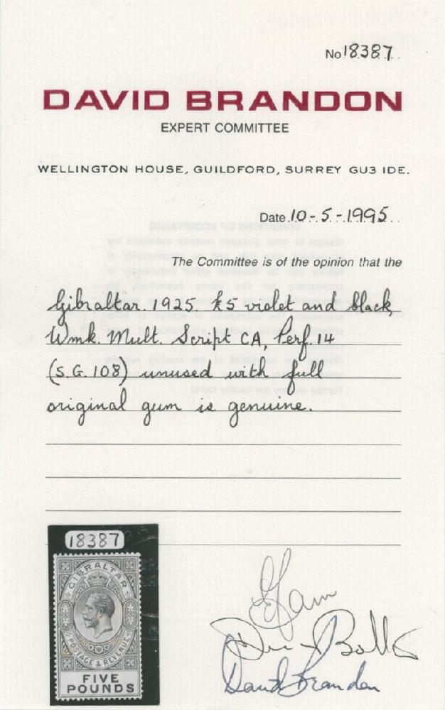 | Zusatzinformationen und Suchstichworte: | Raritan Stamps - 93. Auktion Auktionstermin: 1. - 3. Juni 2022 Los 772 Gibraltar 1925, König Georg V, £5 violett und schwarz, perfekte Zentrierung, einwandfreie Zähnung und kräftige Farben, vollständiger Originalgummi, postfrisch, Pracht und selten so schöner, D. Brandon Attest, dieses Los wurde verkaufte in unser Versteigerung #90 für $1,300 plus entsprechende Kommission, leider die Kunde Rückweg die Los obwohl gültig Attest, Katalogwert $1,750 + +, SG #108, £1,600 als gefalzt, Schätzpreis. $1,500-$2,000 Zuschlag 1.200,00 EUR |