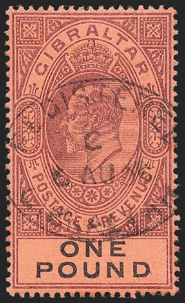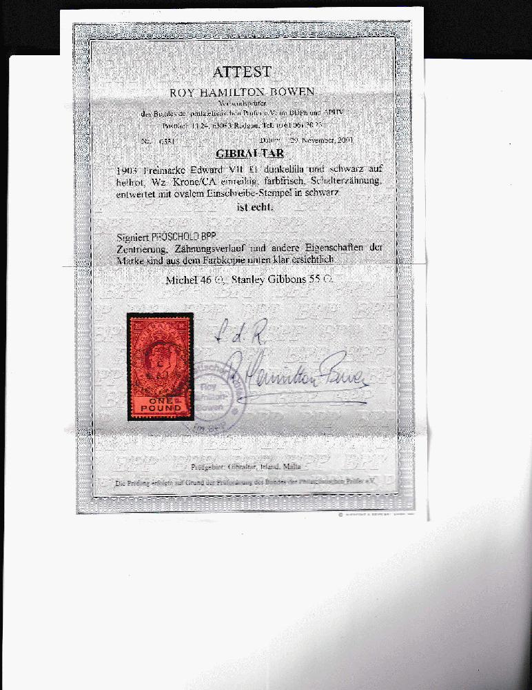 | Zusatzinformationen und Suchstichworte: | Robert A. Siegel - Worldwide Stamps and Postal History Auktionstermin: 21. - 23. Juni 2022 Los 4635 Gibraltar GIBRALTAR, 1903, £1 violett und schwarz auf rot (48; SG 55). Gut zentriert, intensive Farbe, hell 1906 Registratur Stempel, Pracht, mit 2001 Hamilton-Bowen Attest, Scott $750,00, SG £750 Ausruf 200,00 USD |