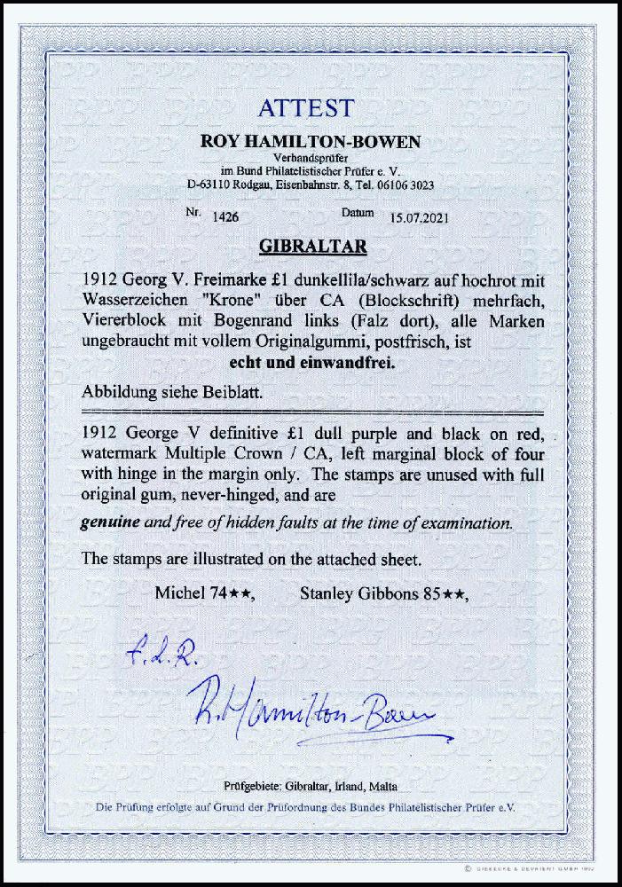 | Zusatzinformationen und Suchstichworte: | Württembergisches Auktionshaus 140. Versteigerung Auktionstermin: 17. - 18. Juni 2022 Los 1152 Gibraltar 1 £, tadellos postfrischer Viererblock mit kpl. li. Bogenrand (Falzrest im Rand). Eine seltene und dekorative Einheit, Fotoattest Hamilton-Bowen BPP. Ausruf 750,00 EUR |