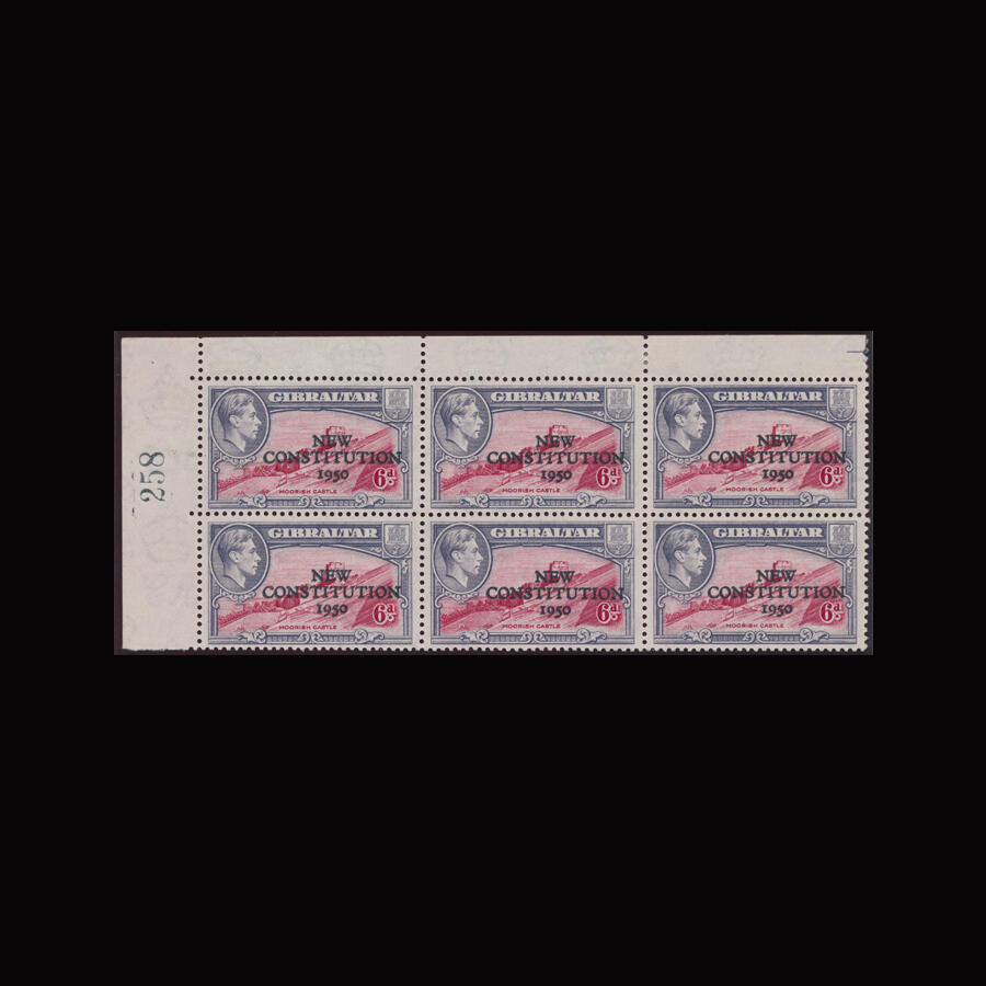 | Zusatzinformationen und Suchstichworte: | Doreen Royan & Associates Shop - Online Los 750294 (D) Gibraltar Gibraltar 1950 King George VI New Constitution 6d. carmine and grey-violet. North West corner block of six with Sheet Number 258 in margin. Variety, ‘Overprint double on all stamps and top Frame re-entry (R1/3)’. KGVI Expertising Certificate No. 1246/05-10 (2010). Superb unmounted mint condition (hinged in margin only). OUTSTANDING AND EXCEEDINGLY RARE Festpreis 5.500,00 GBP |