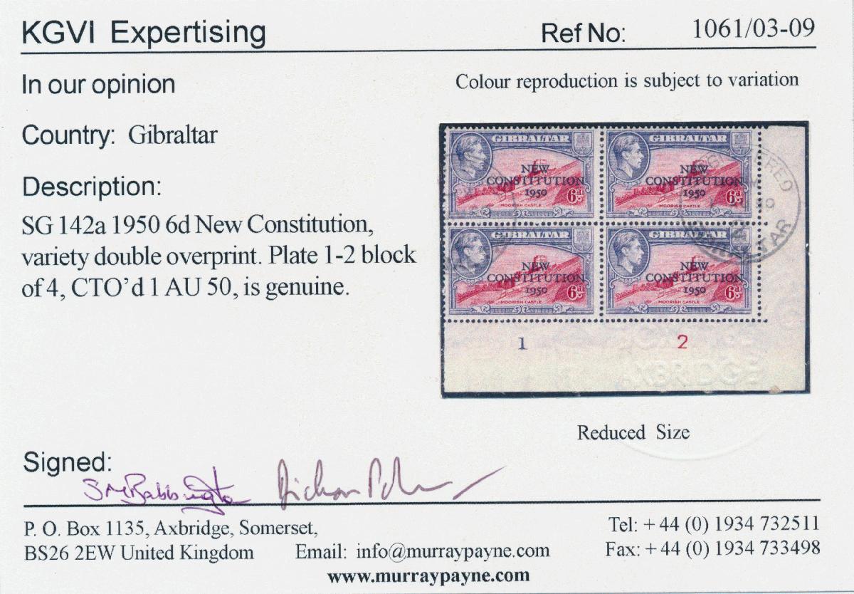 | Zusatzinformationen und Suchstichworte: | Doreen Royan & Associates Shop - Online Los 750866 Gibraltar Gibraltar 1950 King George VI New Constitution. 6d. carmine and grey-violet. South East corner Plate block of four. Cancelled with ‘REGISTERED 1 AU 50 GIBRALTAR’ circular date stamps. Variety, ‘Overprint double on all four stamps)’. KGVI Expertising Certificate No. 1061/03-09 (2009). THIS IS THE UNIQUE POSITIONAL MULTIPLE FROM THE SINGLE SHEET THAT WAS CANCELLED AT GIBRALTAR (THE VARIETY OCCURRED ON ONLY 4 SHEETS – THE OTHER 3 SHEETS WERE NOT CANCELLED) Festpreis 5.000,00 GBP |