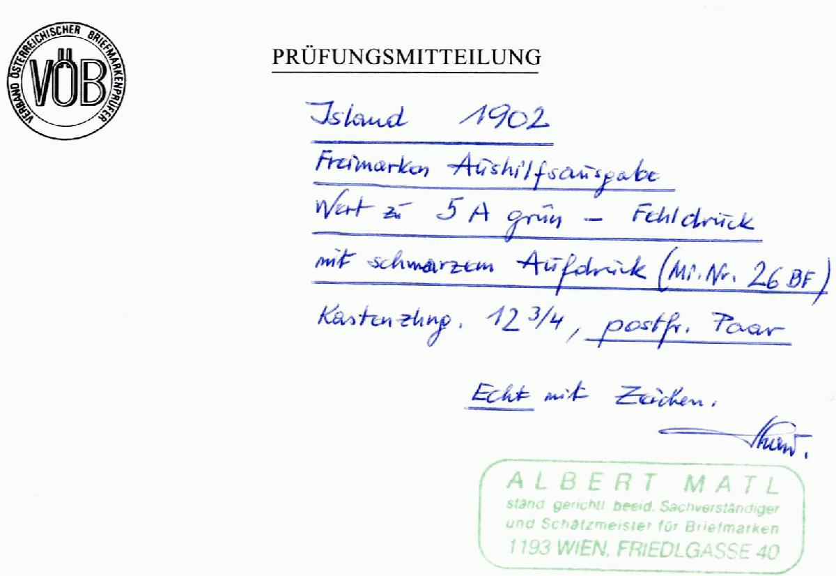 | Zusatzinformationen und Suchstichworte: | 73. Viennafil Live-Auktion Auktionstermin: 31. Mai - 3. Juni 2022 Los 3166 Island 1902, Ziffer im Oval mit Aufdruck Farbfehldruck in schwarz "1 Gildi", 5 A grün im Paar, postfrisch, Geprüft Matl, Mi. 26BF / 1400,- Zuschlag 180,00 EUR |