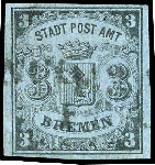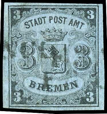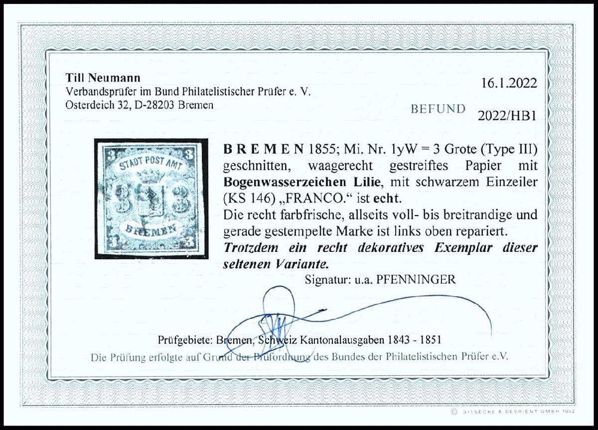| Zusatzinformationen und Suchstichworte: | Dr. Reinhard Fischer 186. Auktion Auktionstermin: 18. - 21. Mai 2022 Los 1409 Altdeutschland Bremen 3 Gr. auf blaugrau, waagerecht gestreiftes Papier mit Wz. "Lilie", vollrandiges Exemplar mit Entwertung durch schwarzen Einzeiler "Franco." (KS 146), links oben repariert, Fotobefund Neumann BPP (2022): "Trotzdem ein recht dekoratives Exemplar dieser seltenen Variante.", Mi. 1.300.- Ausruf 250,00 EUR |