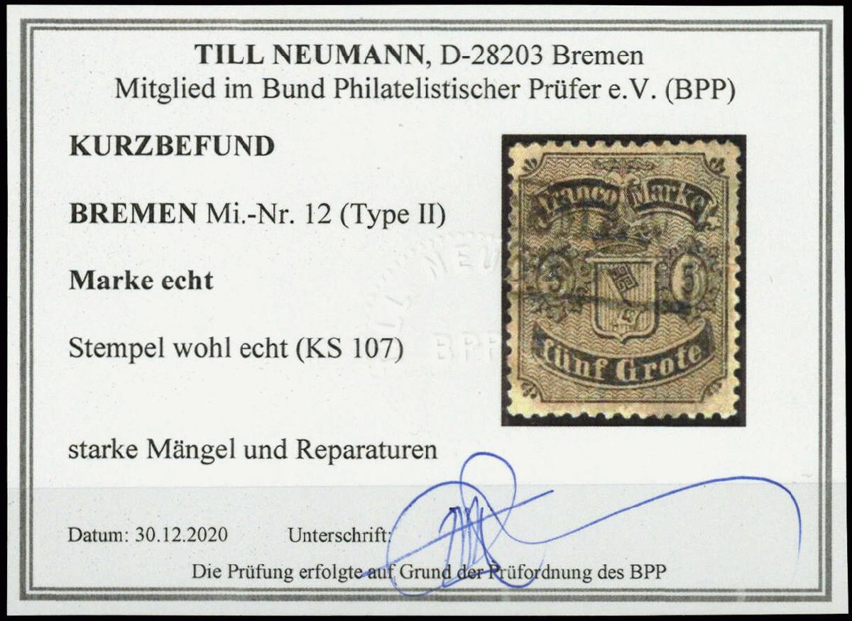| Zusatzinformationen und Suchstichworte: | 74. Badische Briefmarken GmbH Auktion Auktionstermin: 26. Juli 2022 Los 774 D Altdeutschland Bremen 1866/67, 5 Gr. Wappen, gestempelt, repariert mit Mängeln, Kurzbefund Neumann BPP (ME 400,-) GEBOT |