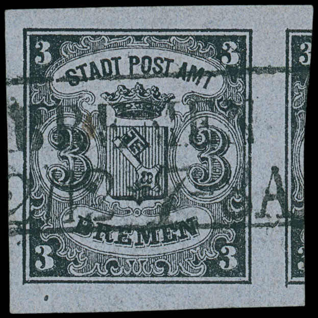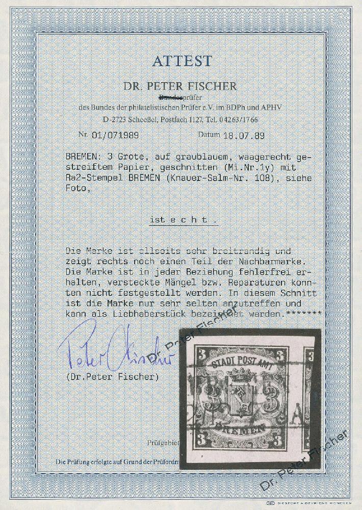 | Zusatzinformationen und Suchstichworte: | 3. Sellschopp Auktion Auktionstermin: 11. Juni 2022 Los 94 Altdeutschland Bremen1855, 3 Grote geschnitten, waagerecht gestreiftes Papier, Type II, sehr farbfrisch und allseits ausgesprochen breit- bis weit überrrandig (mit großem Teil der Nebenmarke rechts), mit sauber und gerade aufgesetztem Ra2 "BREMEN 2/12", Luxus. Eine besonders schöne Marke und sicherlich die "größte" Bremen Eins. Ein wirkliches Ausnahme-Exemplar, für das der Katalogwert keinerlei Bedeutung hat. Signiert Brun (Paris), Fotoattest Dr. Peter Fischer BPP (1989) "Liebhaberstück". Zuschlag 1.150,00 EUR |