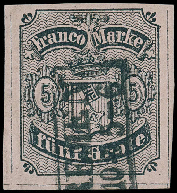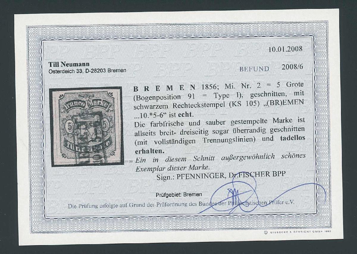 | Zusatzinformationen und Suchstichworte: | 3. Sellschopp Auktion Auktionstermin: 11. Juni 2022 Los 101 Altdeutschland Bremen 1856, 5 Grote schwarz auf hellkarmingrau, Type I, farbfrisch und allseits breit-, meist sogar überrandig geschnitten (dreiseitig mit vollständigen - weit innerhalb liegenden - Trennungslinien), sowie sauber aufgesetztem Rechteckstempel "BREMEN", tadellos. Ein ganz herausragendes Exemplar dieser Marke und als solches eine Seltenheit. Fotobefund Till Neumann BPP (2008). Mi. 400++ Zuschlag 550,00 EUR |