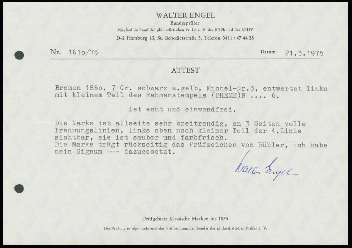 | Zusatzinformationen und Suchstichworte: | nordphila 485. Briefmarkenfernauktion Auktionstermin: 30. Mai 2022 Los 88 Altdeutschland Bremen1860, 7 Gr. schwarz auf rötlichgelb, allseits sehr breitrandig, Kabinett, gepr. Bühler und Attest W. Engel, Mi. (900.-) Ausruf 330,00 EUR |
