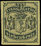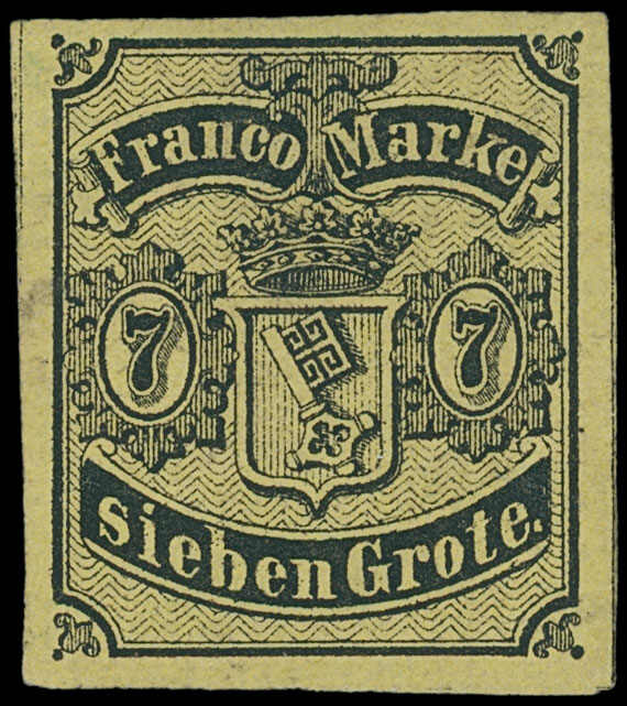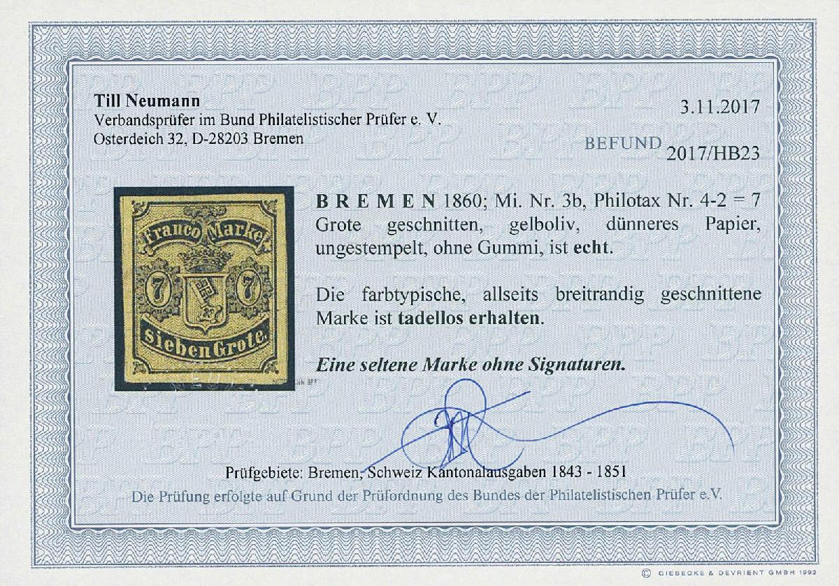 | Zusatzinformationen und Suchstichworte: | 3. Sellschopp Auktion Auktionstermin: 11. Juni 2022 Los 111 Altdeutschland Bremen 1860, 7 Grote geschnitten, schwarz auf gelboliv, dünneres Papier, farbfrisch und allseits breitrandig, ungebraucht ohne Gummi, tadellos. Eine seltene Marke. Fotobefund Till Neumann BPP. Mi. 600+ Zuschlag 1.200,00 EUR |