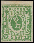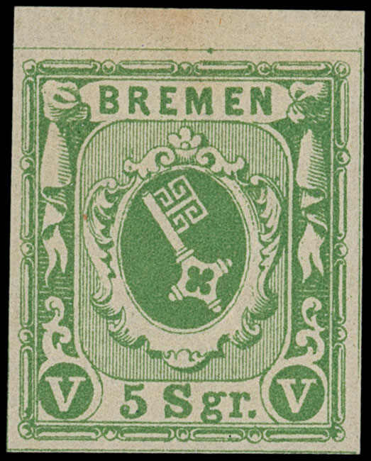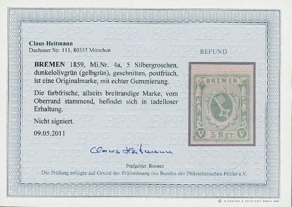 | Zusatzinformationen und Suchstichworte: | 3. Sellschopp Auktion Auktionstermin: 11. Juni 2022 Los 112 Altdeutschland Bremen 1859, 5 Silbergroschen gelbgrün, sehr farbfrisches und allseits besonders breitrandig geschnittenes Oberrandstück, postfrisch, unsigniert, Luxus. Eine sehr schöne Marke. Fotobefund Claus Heitmann BPP. Mi. 400+ Zuschlag 150,00 EUR |