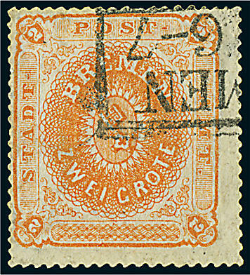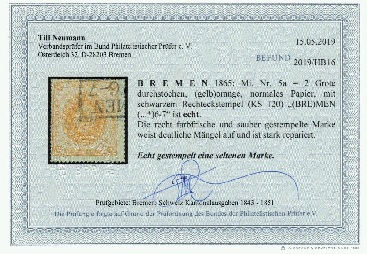 | Zusatzinformationen und Suchstichworte: | Dr. Derichs 165. Auktion Auktionstermin: 10. - 11. Juni 2022 Los 3372 Altdeutschland Bremen 2 Gr. orange "durchstochen", rep., optisch gutes Stück mit Ra2 "Bremen" (Knauer-Salm 120). Echt gestempelt ist die "Bremen 5" eine der seltensten Marken der Altdeutschen Staaten. Trotz ihrer nicht perfekten Qualität ist die hier angebotene Marke ein schönes Belegstück für diese in fast allen Sammlungen noch fehlende Marke. Fotobefund Neumann BPP: "Echt gestempelt eine seltene Marke.". (Michel 2.200.-). Ausruf 350,00 EUR |