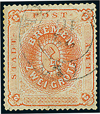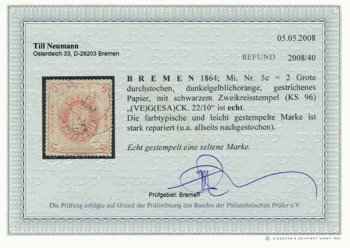 | Zusatzinformationen und Suchstichworte: | Dr. Derichs 165. Auktion Auktionstermin: 10. - 11. Juni 2022 Los 3374 Altdeutschland Bremen 2 Gr. dunkelgelblichorange "durchstochen" auf gestrichenem Papier, gute "c"-Variante, rep., optisch gutes Exemplar mit K2 "Vegesack 22/10". Echt gestempelt eine der seltensten Marken der Altdeutschen Staaten - in fast allen Sammlungen fehlend. Fotobefund Neumann BPP: "Echt gestempelt eine seltene Marke.". (Michel 3.500.-). Ausruf 450,00 EUR |