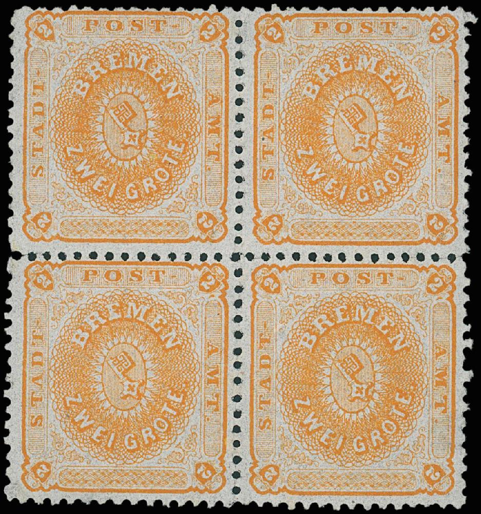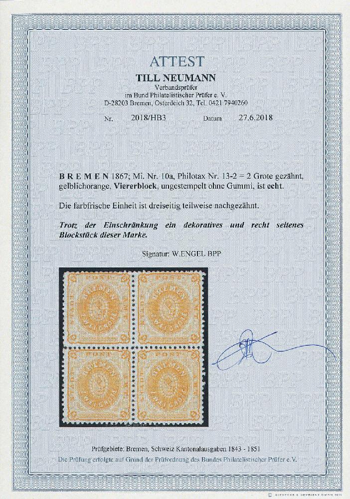 | Zusatzinformationen und Suchstichworte: | 3. Sellschopp Auktion Auktionstermin: 11. Juni 2022 Los 142 Altdeutschland Bremen 1866/67, 2 Grote gezähnt, gelborange, farbfrischer Viererblock, ungebraucht ohne Gummi, teils nachgezähnt. Fotoattest Till Neumann BPP. Mi. 450 Zuschlag 180,00 EUR |