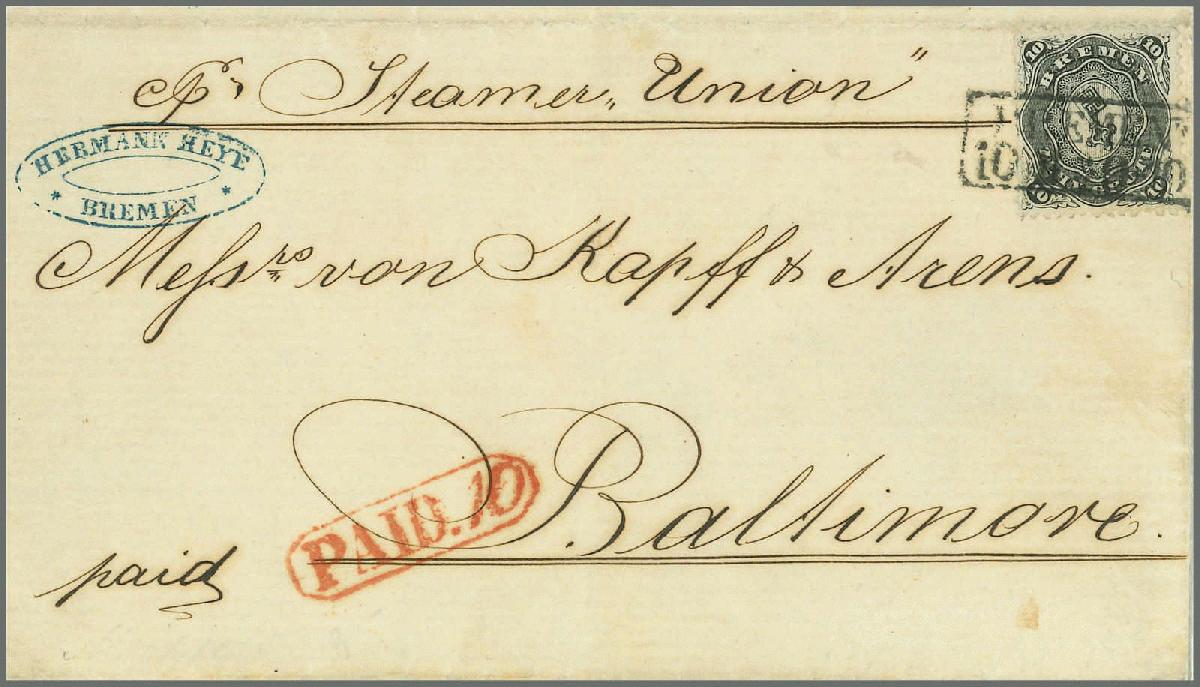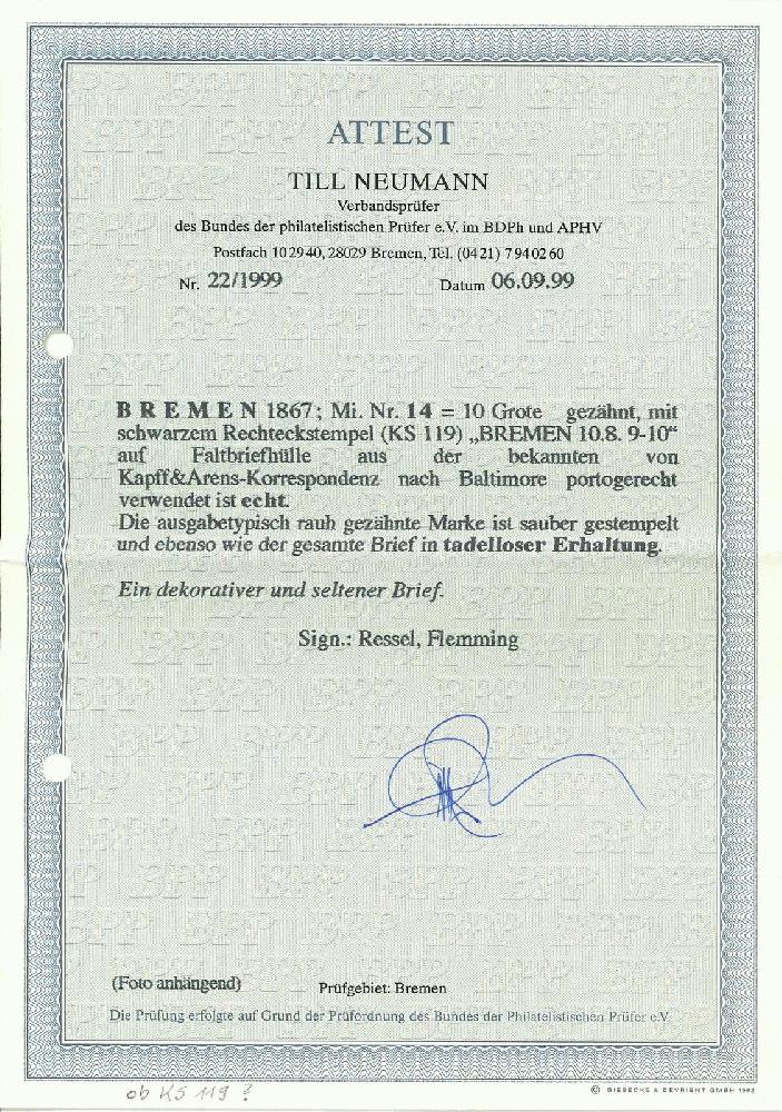 | Zusatzinformationen und Suchstichworte: | Rapp Auktion 2022 Auktionstermin: 2. - 7. Mai 2022 Los 939 Altdeutschland Bremen 10 Gr. schwarz mit einwandfreier Zähnung und übergehendem Rahmenstempel BREMEN 10.8. auf vollständigem Faltbrief nach Baltimore in tadelloser Erhaltung. Ein seltener und sehr schöner Brief aus der bekannten "Kapff & Arens-Korrespondenz". Attest Neumann BPP. Zuschlag 4.000,00 CHF |