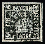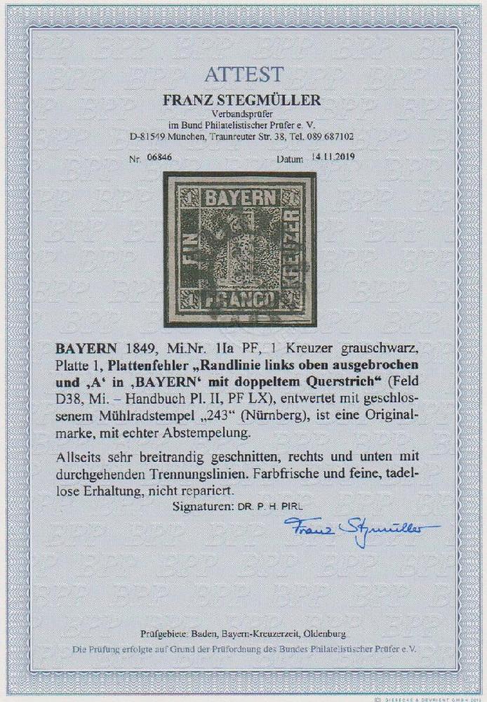 | Zusatzinformationen und Suchstichworte: | Rauhut & Kruschel - 212. Auktion Auktionstermin: 30. Juli 2022 Los 269 Altdeutschland Bayern 1 Kr. schwarz, Platte 1, allseits sehr breitrandiges Kabinettstück mit gMR "243" (Nürnberg), rechts und unten mit durchgehenden Schnittlinien, mit dem markanten Plattenfehler von Feld 38, D-Bogen, "ausgefülltes A in BAYERN und Randlinie links oben ausgebrochen". Sign. Pirl und Attest Stegmüller. Mi. 4000,- Ausruf 1.800,00 EUR |
