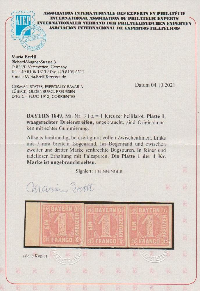 | Zusatzinformationen und Suchstichworte: | Rauhut & Kruschel - 212. Auktion Auktionstermin: 30. Juli 2022 Los 278 Altdeutschland Bayern 1 Kr. rosa, Platte 1, waagerechter ungebrauchter Dreierstreifen vom linken Bogenrand, dort und zwischen 2. und 3. Marke Bugspur, Marken tadellos mit Originalgummi. Von der Platte 1 eine sehr seltene ungebrauchte Einheit, sign. Pfenninger und Attest Brettl "tadellos". Mi. 1400,- Ausruf 700,00 EUR |