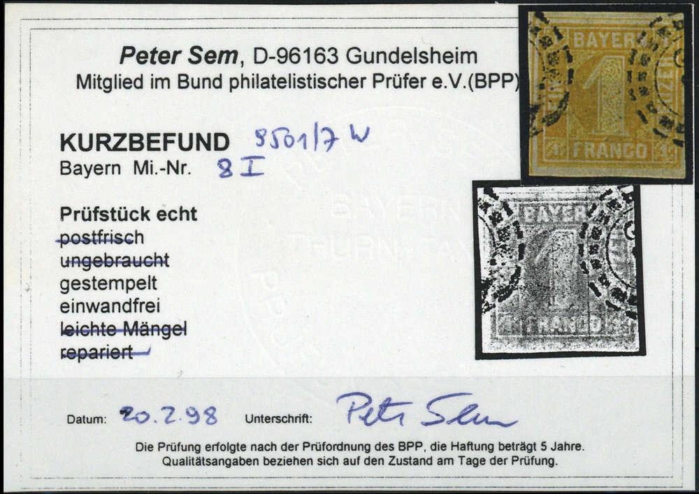 | Zusatzinformationen und Suchstichworte: | 74. Badische Briefmarken GmbH Auktion Auktionstermin: 26. Juli 2022 Los 210 D Altdeutschland Bayern 1862, 1 Kr. gelb, dreiseitig breit-überrandig, gestempelt mit oMR, sign. Brun und Kurzbefund Sem BPP "echt, einwandfrei" GEBOT |