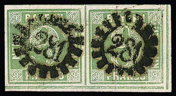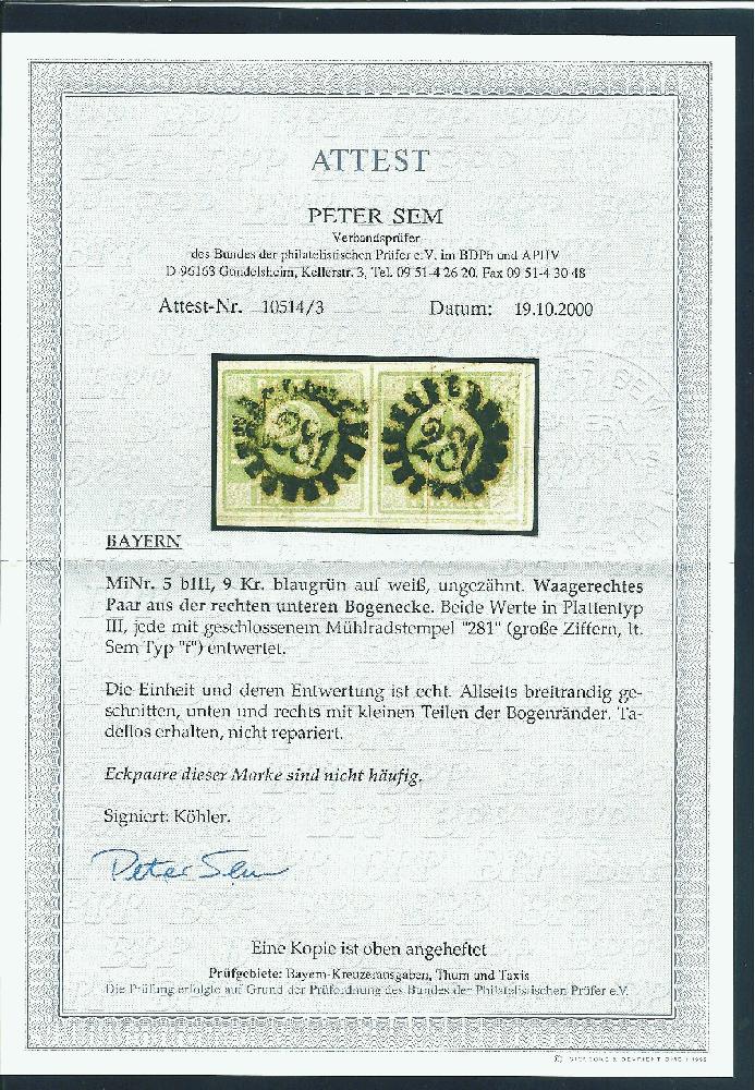 | Zusatzinformationen und Suchstichworte: | Rauhut & Kruschel - 212. Auktion Auktionstermin: 30. Juli 2022# Los 291 Altdeutschland Bayern 9 Kr. blaugrün, Type III, Kabinettpaar aus der rechten unteren Bogenecke mit gMR "281" von Regensburg in besserer Type. Bogeneckenpaare dieser Marke sind selten! Sign. Köhler und Attest Sem. Mi. 1000,- + Ausruf 350,00 EUR |