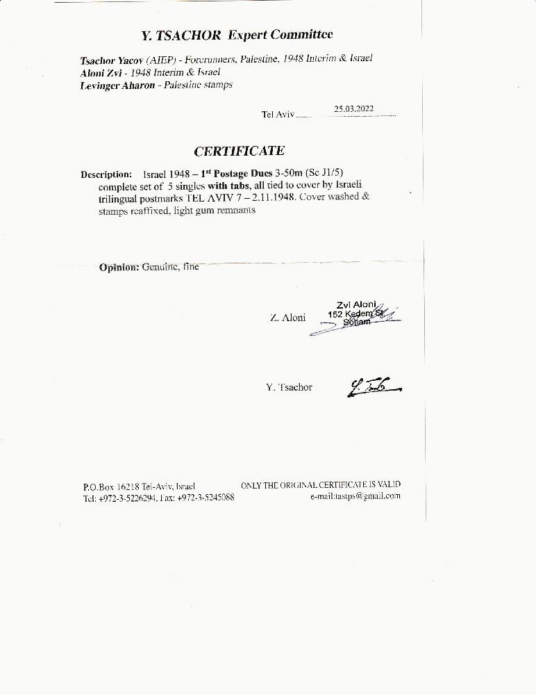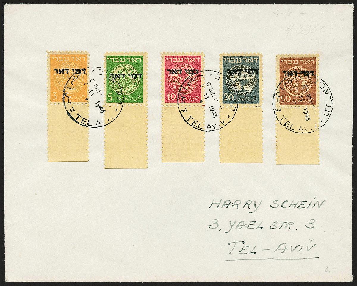 | Zusatzinformationen und Suchstichworte: | Robert A. Siegel - Worldwide Stamps and Postal History Auktionstermin: 21. - 23. Juni 2022 Los 4965 Israel ISRAEL, 1948,3m-50m erster Portomarken (J1-J5; PD1-PD5). Satzes mit Volltabs entwertet mit dreisprachige Tel Aviv 2,11,1948 Kreisdatumsstempel auf Ortsbrief, Attest vermerkt "Brief gewaschen und Briefmarken wieder befestigt, hell Gummi-Reste", Pracht und selten anzutreffen ein kompletter Satz mit die Nachgebühr Satzes mit Volltabs auf Brief, mit 2022 Tsachor Attest, Bale $3,200 Ausruf 750,00 USD |