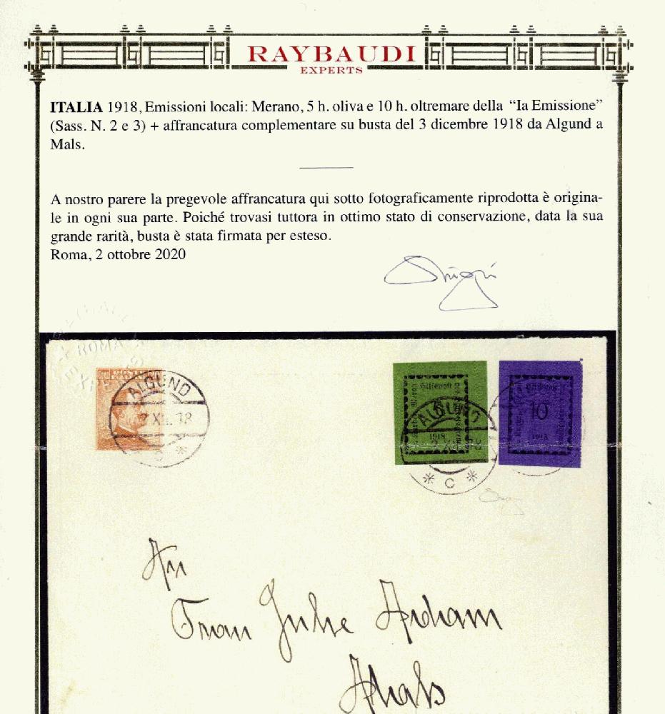 | Zusatzinformationen und Suchstichworte: | 73. Viennafil Live-Auktion Auktionstermin: 31. Mai - 3. Juni 2022 Los 1331 Italien Lokalausgabe Meran 1918, busta affrancata con 5 e 10 Heller più 20 cent. Regno d'Italia da Algund 3.12.18 a Mals, cert. oro RAY, Sass. 2, 3 / 15.000,- 1918, Briefkuvert mit 5 und 10 Heller aus Algund 3.12.1918 nach Mals, sehr selten Frankatur, Garantieattest RAY, ANK 2, 3 Ausruf 950,00 EUR |