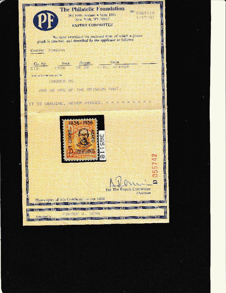 | Zusatzinformationen und Suchstichworte: | Robert A. Siegel - Worldwide Stamps and Postal History Auktionstermin: 21. - 23. Juni 2022 Los 5018 Panama PANAMA, 1936,5c auf - 1/2c Orange (C19). Postfrisch ausgezeichnete Zentrierung, Pracht, nur 200 Stücke überdruckt, mit 2001 P. F. Attest, Scott $400,00 als gefalzt, vom Kofferträger W. Venn II Bestand Ausruf 200,00 USD |