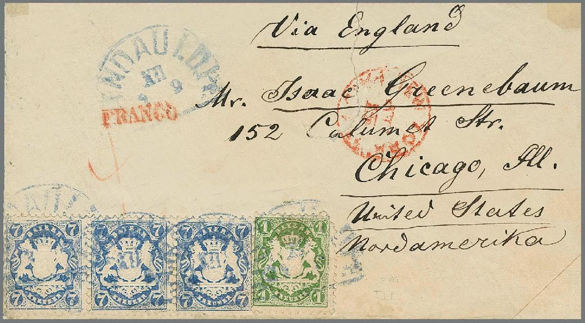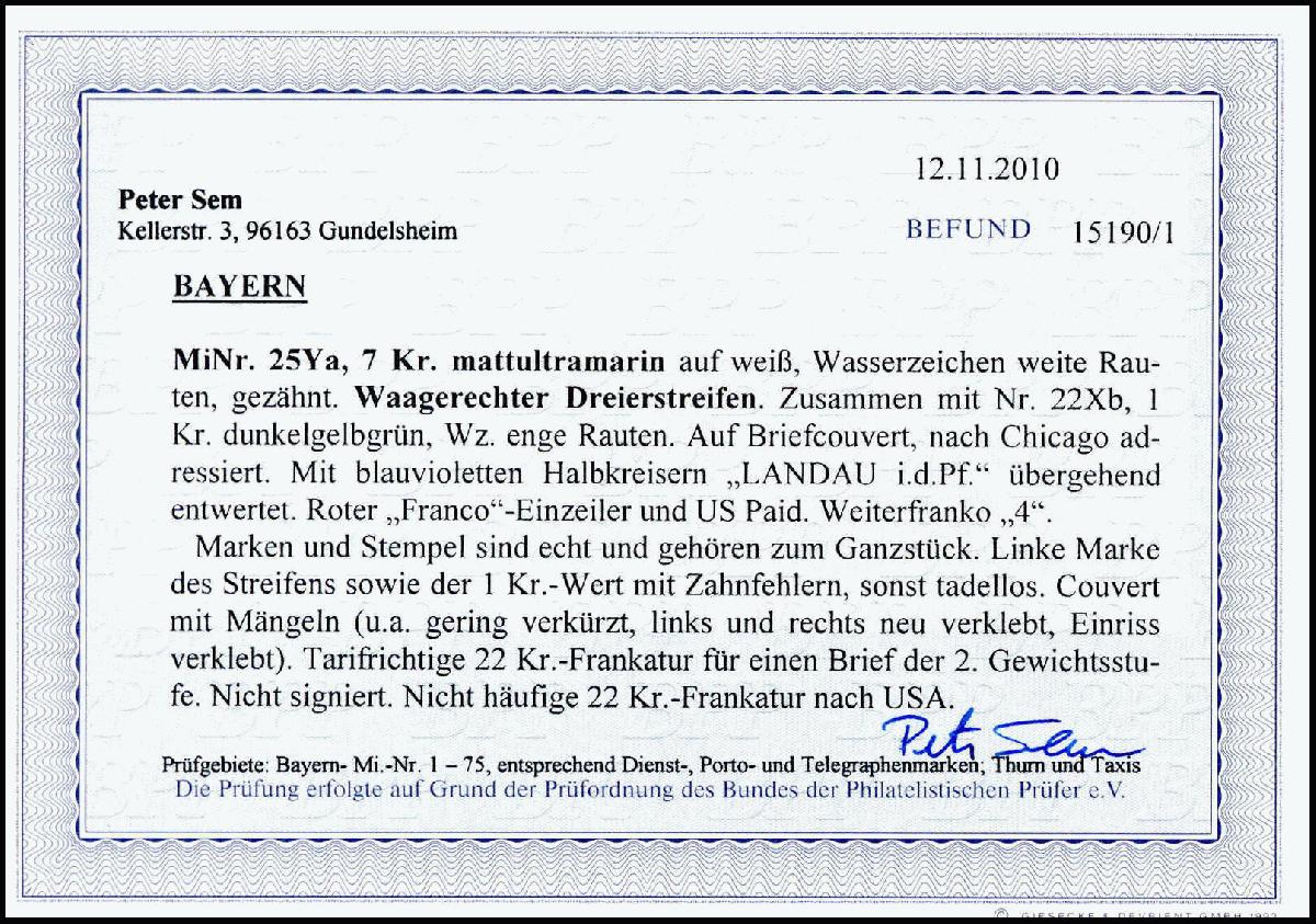 | Zusatzinformationen und Suchstichworte: | Rauhut & Kruschel - 212. Auktion Auktionstermin: 30. Juli 2022 Los 326 Altdeutschland Bayern 1 Kr. dunkelgrün (Zf.) in Mischfrankatur mit waagerechtem Dreierstreifen 7 Kr. ultramarin (Wz."weite Rauten") auf etwas ausgebessertem Couvert von Lindau nach Chicago/USA. Seltene Kombination, Fotoexp. Sem Ausruf 450,00 EUR |