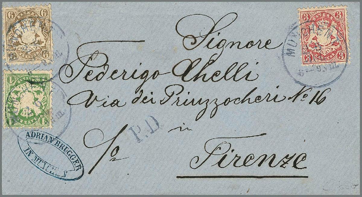 | Zusatzinformationen und Suchstichworte: | Rauhut & Kruschel - 212. Auktion Auktionstermin: 30. Juli 2022 Los 335 Altdeutschland Bayern 6 Kr. ockerbraun, gutes Wasserzeichen, nebst 1 Kr. dunkelgrün und 3 Kr. rosa auf Auslandscouvert (dieses rechts unbed. Einriß) mit blauem K1 "München" nach Florenz. Bei der 6 Kr. eine Zahnspitze verkürzt, Attest Brettl "Alle Zähne vorhanden. In farbfrischer, feiner und tadelloser Erhaltung... Ein attraktiver ... Brief". Ferner sign. Sem Ausruf 220,00 EUR |
