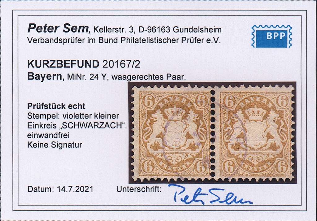 | Zusatzinformationen und Suchstichworte: | Uwe von Poblocki Los 0948702693 Altdeutschland Bayern 1870, 6 Kr. braun Wappen gezähnt mit weitem Wz., waagerechtes Paar mit KLEINEM zentrischem violettem EK von "SCHWARZACH", Paar mittig wie üblich leicht vorgefaltet, hervorragend gezähnt und ohne Signaturen mit FKB Sem BPP "einwandfrei" Festpreis 150,00 EUR |