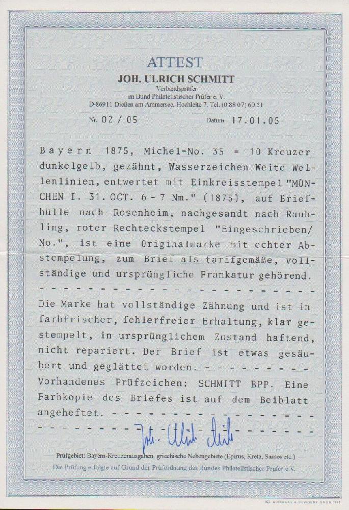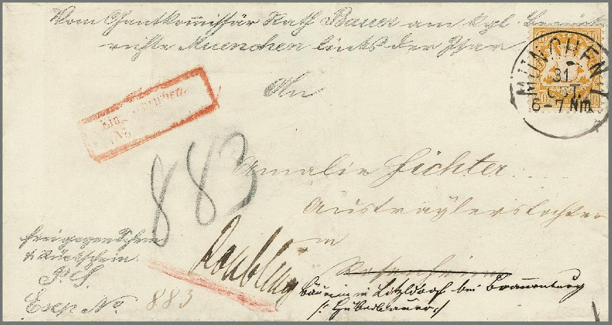 | Zusatzinformationen und Suchstichworte: | Rauhut & Kruschel - 212. Auktion Auktionstermin: 30. Juli 2022 Los 345 Altdeutschland Bayern 10 Kr. dunkelgelb, Wasserzeichen "weite Welle", Kabinettstück einzeln auf teils hektographiertem Einschreibebrief (dieser mit leichter Reinigung) von München (zentr. K1) nach Rosenheim und weitergesandt nach Raubling. Mi. 2000,-, eine Einzelfrankatur der Nr. 35 ist nicht häufig! Attest Schmitt Ausruf 350,00 EUR |