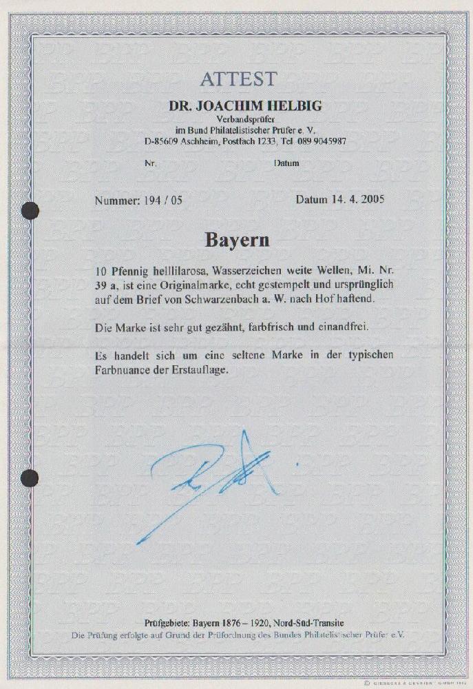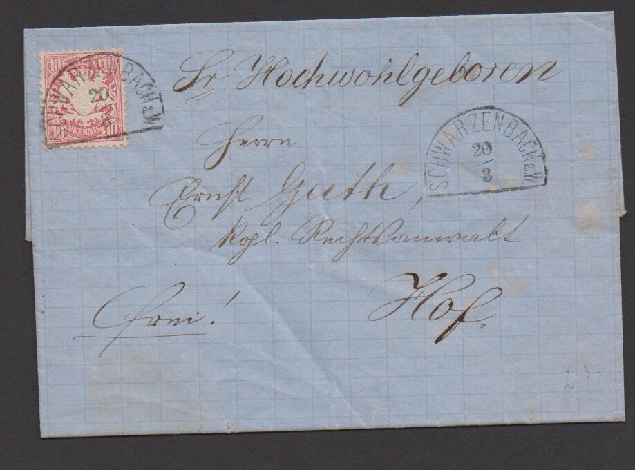 | Zusatzinformationen und Suchstichworte: | Rauhut & Kruschel - 212. Auktion Auktionstermin: 30. Juli 2022 Los 346 Altdeutschland Bayern 10 Pfg. helllilarosa, Erstauflage, Kabinettstück mit klarem HK "Schwarzenbach a.W." auf Faltbrief nach Hof, Attest Helbig. Mi. 200,- Ausruf 50,00 EUR |