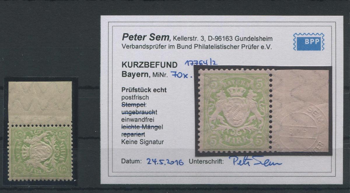 | Zusatzinformationen und Suchstichworte: | Mirko Franke 103. Auktion Auktionstermin: 24. - 25. Juni 2022 Los 762 Altdeutschland Bayern "5Mk. Staatswappen 1900, postfrisch vom rechten Bogenrand, Farbfotobefund Sem BPP "ECHT + EINWANDFREI" (60,-++)." GEBOT |