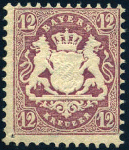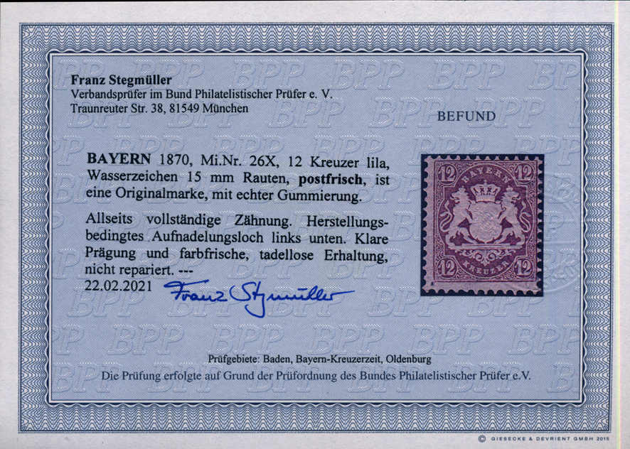 | Zusatzinformationen und Suchstichworte: | 73. AAK Phila GmbH Auktion Auktionstermin: 7. Mai 2022 Los 2139 (D) Altdeutschland Bayern 12 Kr dkl´braunpurpur, postfr. Pracht m. herstellungsbedingtem Aufnadelungsloch li.u. (kein Mangel) m. tadellosem Befund Stegmüler BPP "klare PRägung, farbfrisch", R Katalogpreis: 1000,- EUR Zuschlag 250,00 EUR |