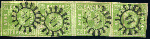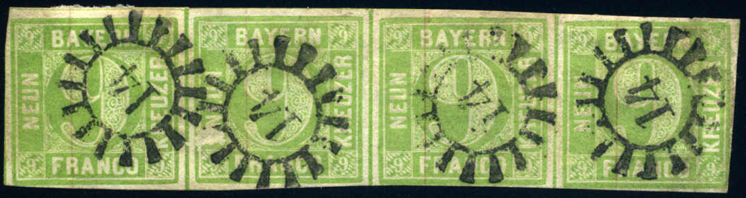 | Zusatzinformationen und Suchstichworte: | 73. AAK Phila GmbH Auktion Auktionstermin: 7. Mai 2022 Los 2124 D Altdeutschland Bayern 9 Kr gelbl´grün im waagr. 4er-Streifen m. 4x zentr. gMR "14" FA Stegmüller BPP m. kleinen Einschränkungen "klare Abstempelungen, farbfrisch", seltener 4er-Streifen!!! Katalogpreis: 4000,- EUR Ausruf 800,00 EUR |