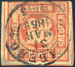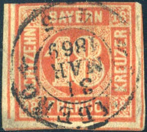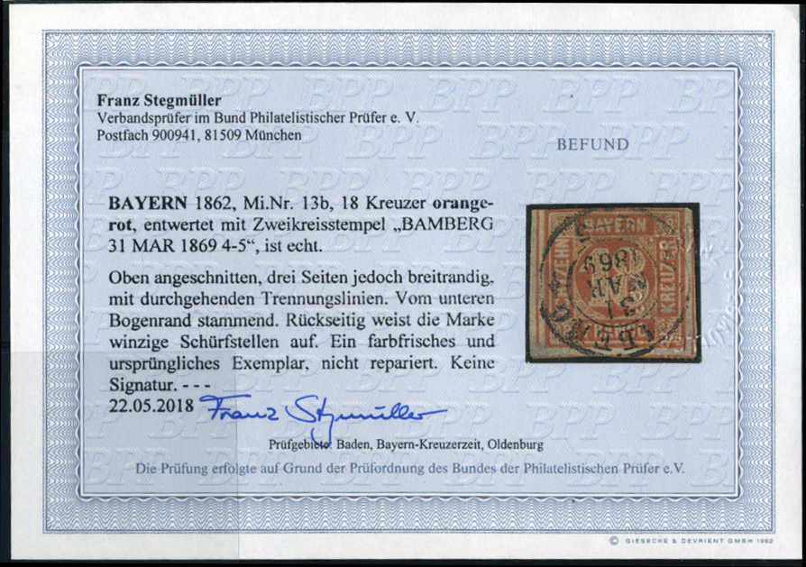 | Zusatzinformationen und Suchstichworte: | 73. AAK Phila GmbH Auktion Auktionstermin: 7. Mai 2022 Los 2134 (D) Altdeutschland Bayern 18 Kr orangerot, zentr. K2 BAMBERG m. Befund Stegmüler BPP "echt, oben angeschnitten, sonst breitrandig, vom unteren Bogenrand, rs. winzige Schürfstellen, farbfrisch und ursprünglich" Katalogpreis: 600+,- EUR Ausruf 120,00 EUR |