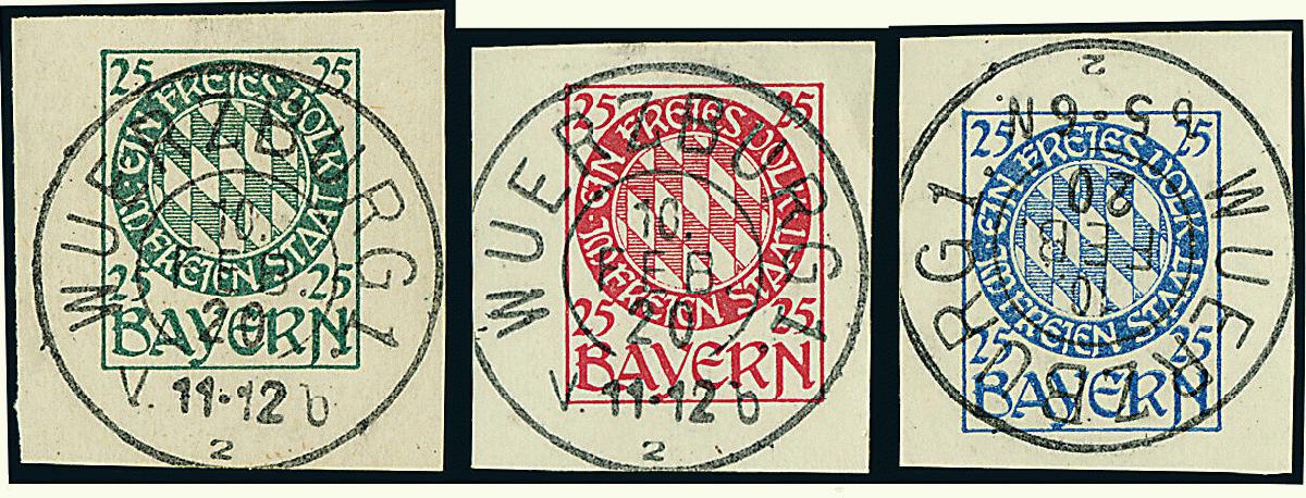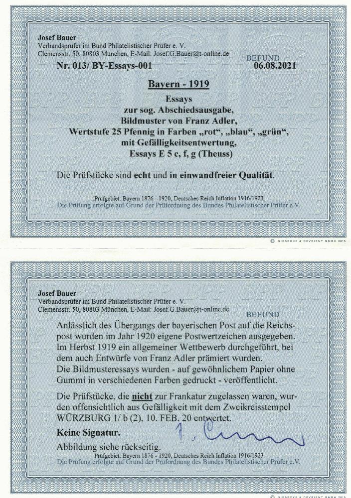 | Zusatzinformationen und Suchstichworte: | Dr. Derichs 165. Auktion Auktionstermin: 10. - 11. Juni 2022 Los 3125 Altdeutschland Bayern \ESSAYS\: 25 Pfg., Essays zur sog. Abschiedsausgabe, Bildmuster von Franz Adler, in den Farben "Rot", "Blau" und "Grün", echt gestempelt "Wuerzburg 10.Feb.20" (Gefälligkeitsentwertung). Die Essays waren zur Frankatur nicht zugelassen und sind gestempelt äußerst selten. Neuer Fotobefund Bauer BPP: "in einwandfreier Qualität". Zuschlag 190,00 EUR |