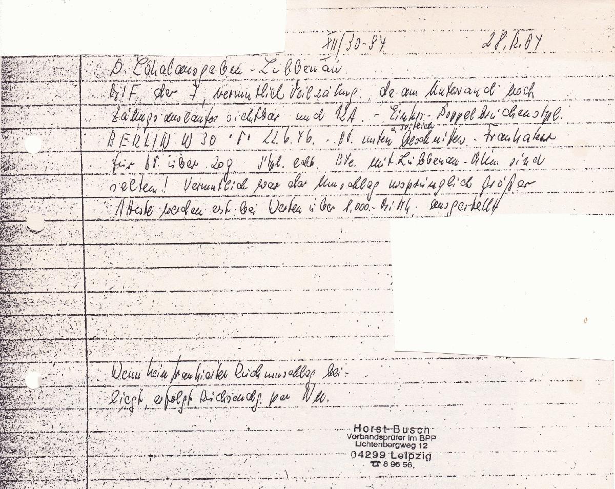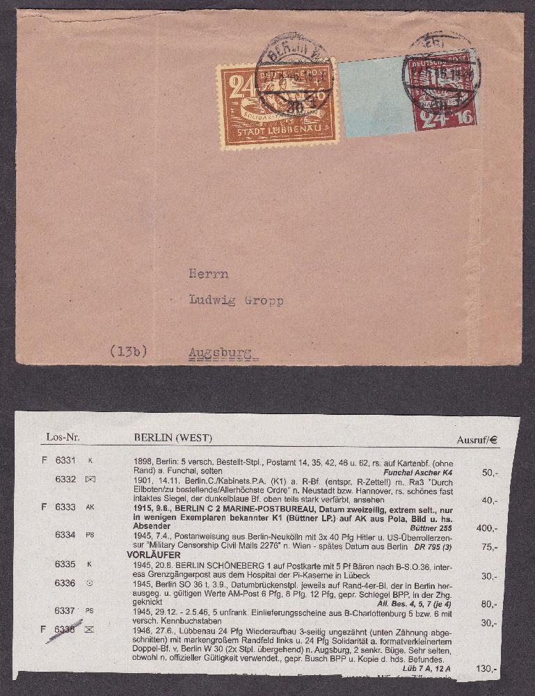 | Zusatzinformationen und Suchstichworte: | Transkription der Prüfbeurteilung: [I]"D. Lokalausgaben – Lübbenau MiF der 7, vermutlich Teilzähnung, da am Unterrand noch Zähnungsausläufer sichtbar und 12A – Links Doppelbrückenstpl. BERLIN W 30 ‚f‘ 22.6.46 – Bf. Unten u. seitlich beschnitten Frankatur für Bf. Über 20 g Stpl. Echt mit Lübbenau-Marken (?) sind selten! Vermutlich war der Umschlag ursprünglich größer. Atteste werden erst bei Werten über 1000 MiMk ausgestellt Wenn kein frankierter Rückumschlag bei- liegt, erfolgt die Rücksendung per Nn (=Nachnahme)"[/I] |