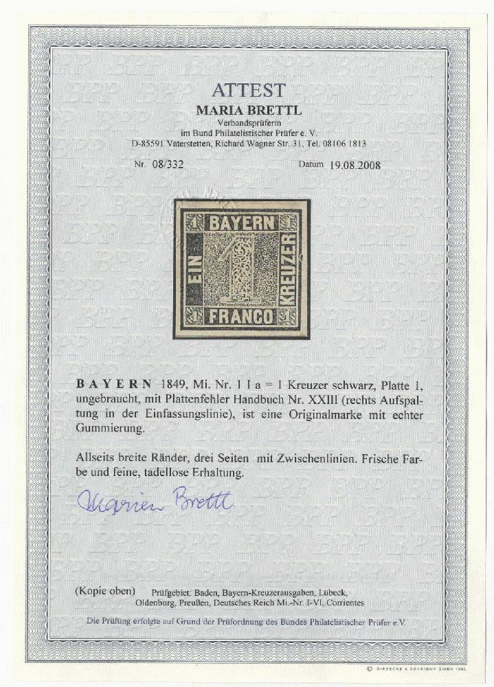 | Zusatzinformationen und Suchstichworte: | 70. Deider Auktion Auktionstermin: 20. Mai 2022 Los 2007 Altdeutschland Bayern 1 Kreuzer schwarz, Platte 1, mit Plattenfehler Handbuch Nr. XXIII "rechts Aufspaltung in der Einfassungslinie", ungebrauchtes Kabinettstück mit voller Originalgummierung, Fotoattest Brettl BPP. Zuschlag 600,00 EUR |