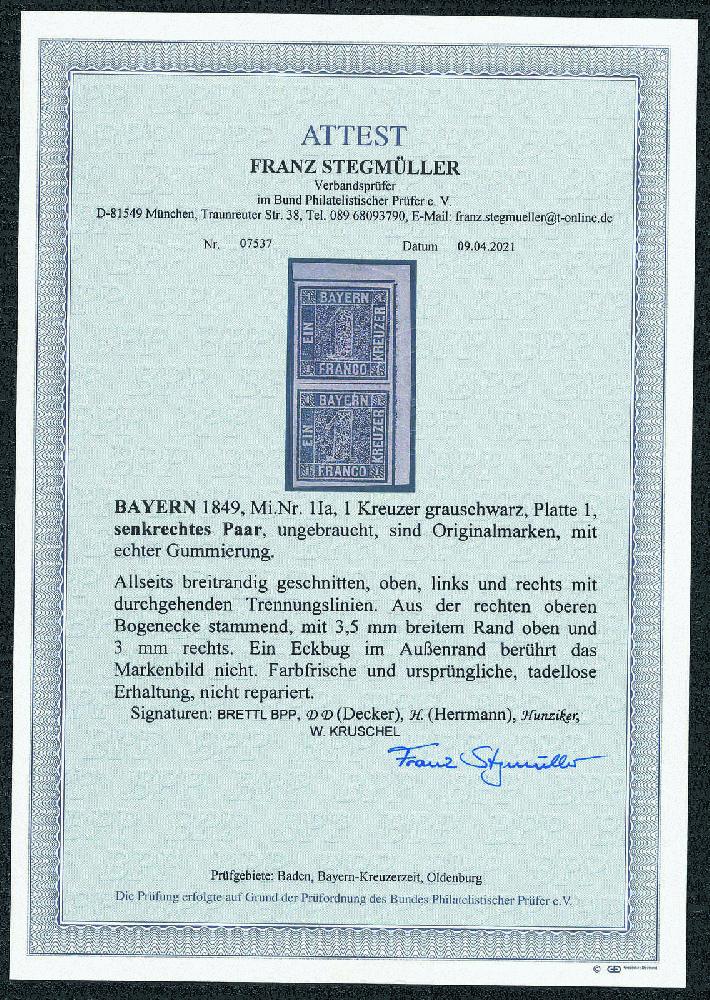 | Zusatzinformationen und Suchstichworte: | Gert Müller 114. Auktion Auktionstermin: 25. Mai 2022 Los 2761 Altdeutschland Bayern 1 Kr. grauschwarz, Platte 1, ein traumhaft schönes senkrechtes Luxuspaar aus der rechten oberen Bogenecke, allseits breitrandig, dreiseitig mit vollständigen Trennungslinien. Eine Zierde für die anspruchsvolle Bayern-Spezialsammlung! Fotoattest "TADELLOSE ERHALTUNG" Stegmüller BPP. Zuschlag 2.250,00 EUR |