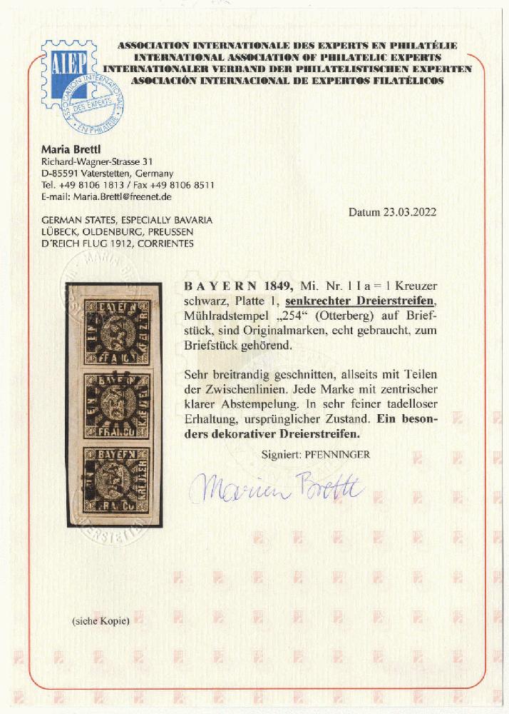 | Zusatzinformationen und Suchstichworte: | 70. Deider Auktion Auktionstermin: 20. Mai 2022 Los 2021 Altdeutschland Bayern 1 Kreuzer schwarz, Platte 1, senkrechter Luxus-Dreierstreifen auf dekorativem Briefstück, je Marke zentrisch gestempelt "254" OTTERBERG, gepr. Pfenninger sowie ganz neues Fotoattest Brettl AIEP, einer der schönsten Dreierstreifen! Zuschlag 14.500,00 EUR |