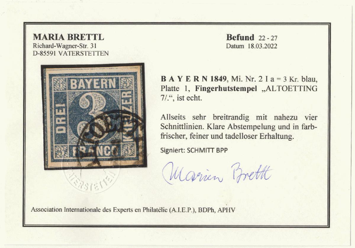 | Zusatzinformationen und Suchstichworte: | 70. Deider Auktion Auktionstermin: 20. Mai 2022 Los 2036 Altdeutschland Bayern 3 Kr. blau, Pl. 1, Luxusstück mit klarem Fingerhutstpl. "ALTOETTING", sign. Schmitt BPP und Fotobefund Brettl. Zuschlag 380,00 EUR |